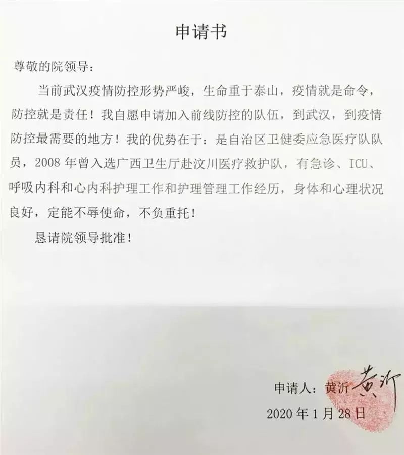 廣西中醫藥大學第一附屬醫院14個科室的護理人員(除休產假人員外)全員請戰。有的護士提前結束休假,在回程的車上寫下戰書……作為醫院的護理部主任,黃沂在看到護士們的請戰書時內心充滿了感動。她在自己的請戰中這樣寫到:“當前武漢疫情防控形勢嚴峻,生命重于泰山,疫情就是命令,防控就是責任!我自愿申請加入前線防控的隊伍,到武漢,到疫情防控最需要的地方!我的優勢在于:是自治區衛生健康委應急醫療隊隊員,2008年曾入選廣西赴汶川醫療救護隊(待命出發),有急診、ICU、呼吸內科和心內科護理工作和護理管理工作經歷,身體和心理狀況良好,定能不辱使命,不負重托!”