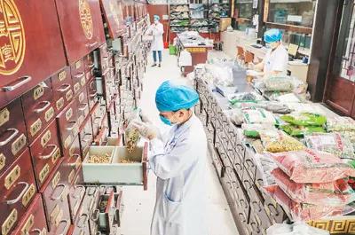 山東省滕州市中醫(yī)醫(yī)院中藥師將中藥材裝斗。宋海存攝(人民視覺)