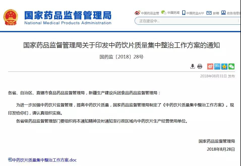 為進一步加強中藥飲片監(jiān)督管理,提高中藥飲片質(zhì)量,根據(jù)今年8月國家藥監(jiān)局發(fā)布的《關(guān)于印發(fā)中藥飲片質(zhì)量集中整治工作方案的通知》要求,從今年10月開始對全國各省(區(qū)、市)中藥飲片進行為期一年的質(zhì)量集中整頓,要求各省市完成嚴(yán)厲查處中藥飲片違法違規(guī)行為和加快完善符合中藥飲片特點的技術(shù)管理體系這兩項重點工作。《通知》指出,將嚴(yán)查中藥飲片的生產(chǎn)、流通以及經(jīng)營中的違法行為。同時,要嚴(yán)厲查處不合格中藥飲片,針對重點區(qū)域和重點品種加大抽檢頻次。