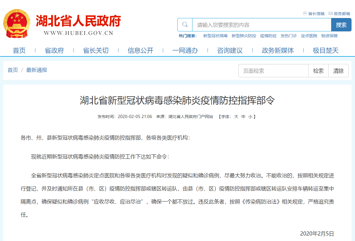 2月5日,湖北省新型冠狀病毒感染肺炎疫情防控指揮部,就近期新型冠狀病毒感染肺炎疫情防控工作下達命令,命令要求確保疑似和確診病例“應收盡收、應治盡治”,確保一個都不放過。違反者,按照《傳染病防治法》相關規定,嚴格追究責任。命令全文如下:
