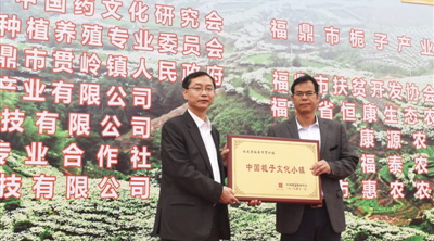 圖為中國藥文化研究會會長禹同生(左)向福鼎市貫嶺鎮授牌“中國梔子文化小鎮”。 本報記者 巨 鋒/攝