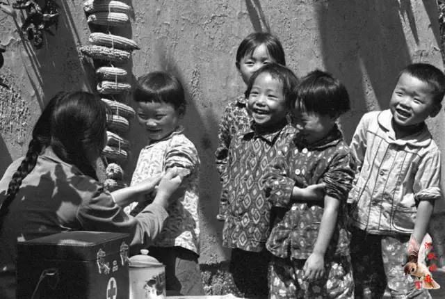 河南省商水縣練集公社劉樓大隊(duì)赤腳醫(yī)生對(duì)農(nóng)村兒童進(jìn)行疾病預(yù)防工作(1974年攝)。