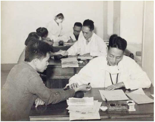 照片中有三位醫生,前面兩位醫生在號脈,后面一位已經在開方,還有一位護士在協助。三位患者,一位是男性,兩位女性。20世紀50年代末缺醫少藥,候診的患者自然不會少,但診室內井然有序,看不到就診場面的混亂,患者只等哪位醫生空閑下來,就到醫生跟前就診。醫生胸前掛著聽診器,白大衣筆挺整潔,切脈問診,透出一種自信。這一幅醫患和諧,其樂融融的圖景真是別樣溫馨。正如《素問·脈要精微論》言“持脈有道,虛靜為保”,輕聲細語的問候,“三部九候”的溫情傳遞,從中醫師把手搭上患者的“寸口”開始,醫患之間就建立起了彼此的信任。