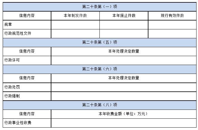 各行政機關年度報告格式模板附后。此前有關政府信息公開的各類報告和統(tǒng)計口徑,隨原政府信息公開條例的失效而失效。政府信息公開工作主管部門負責匯總的本級政府年度報告格式,參照這一格式模板辦理。黨的工作機關加掛行政機關牌子的單位,年度報告內(nèi)容依據(jù)全國政府信息公開工作主管部門發(fā)布的有關規(guī)定(國辦公開辦函〔2019〕51號)確定,并參照這一格式模板辦理。